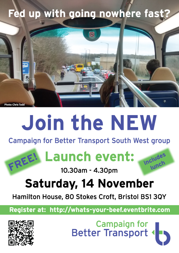 What’s your beef with transport in the South West? Join the new transport group being launched on Saturday, 14 November in Bristol – FREE event including lunch. Register now