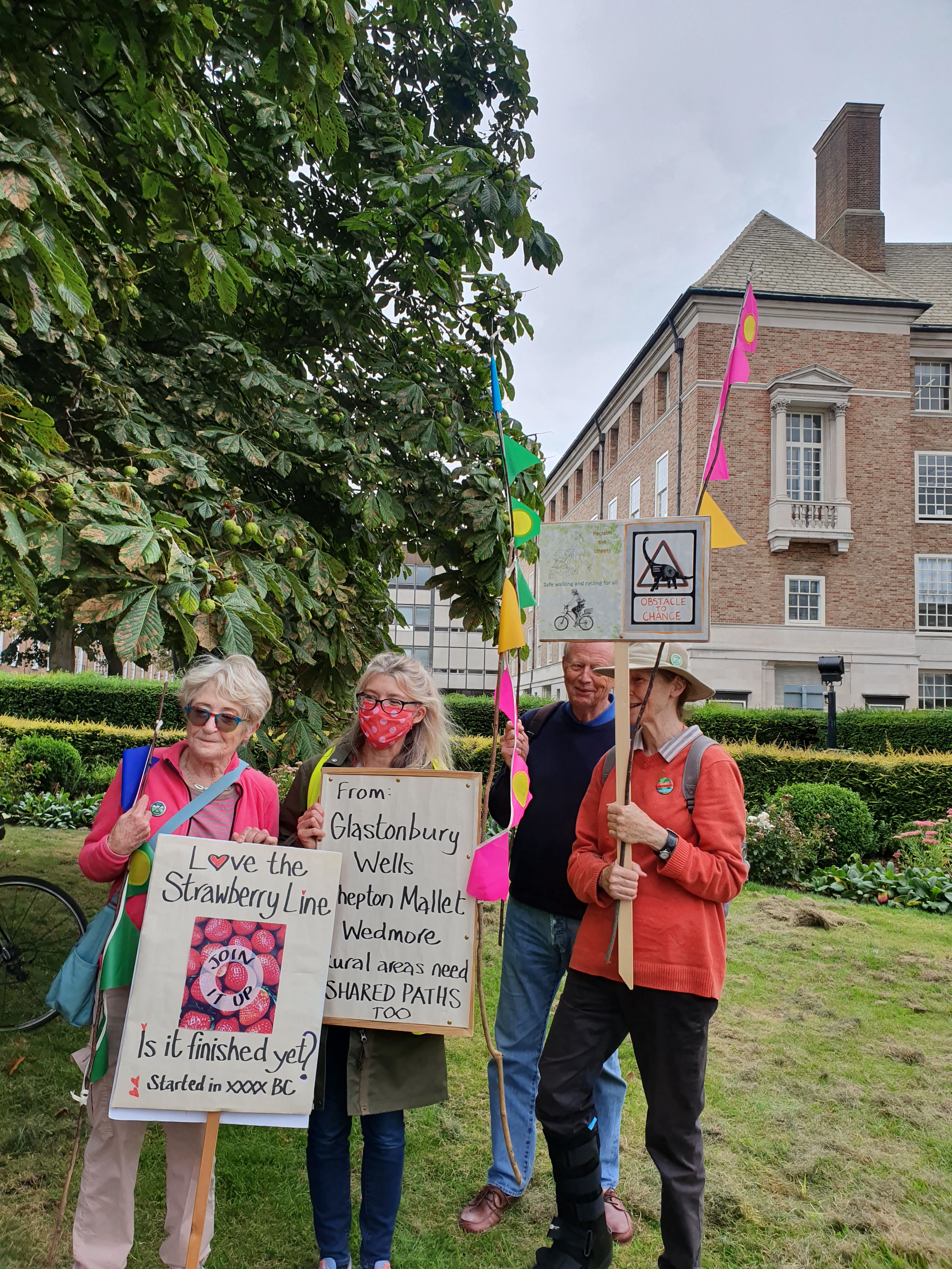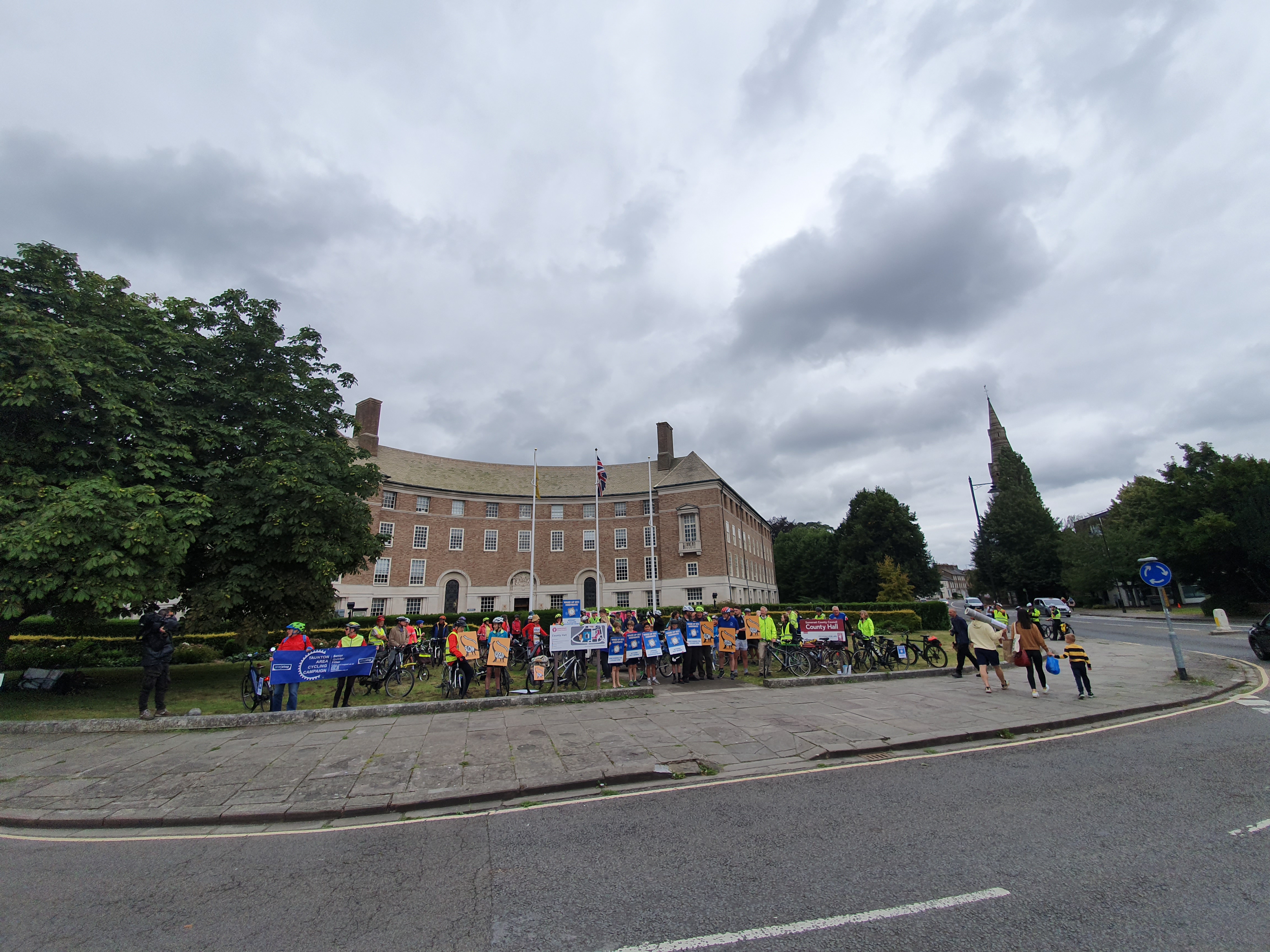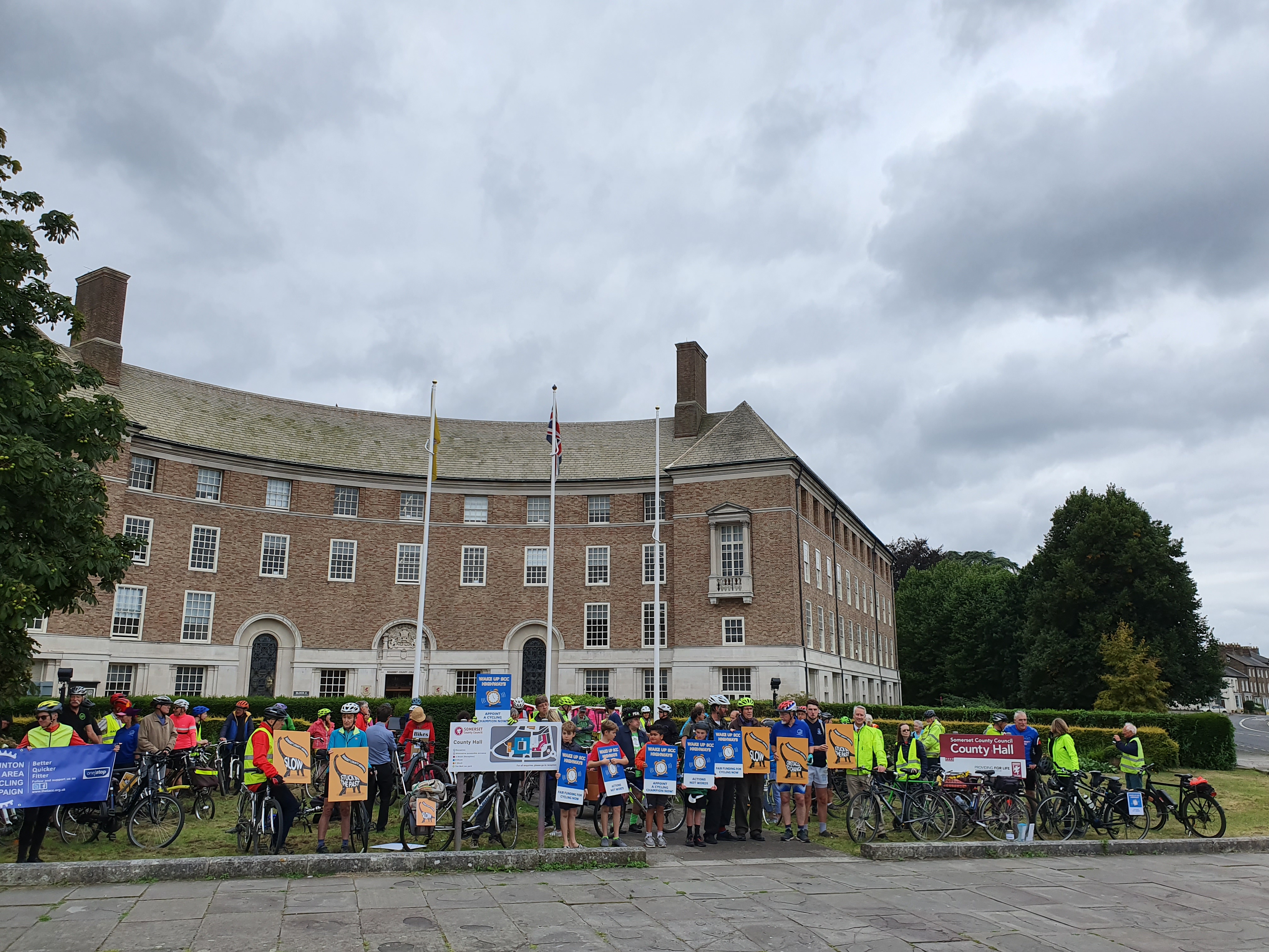 There was an amazing turnout of over 60 cyclists and pedestrians from all over Somerset that congregated outside Somerset County council to call for more action on more infrastructure for walking and cycling on Wednesday 1st Sep. Protesters called for more action. Somerset County Council has to stop dragging its feet with warm words but little tangible progress. Design and maintenance of cycling infrastructure needs to improve. Pedestrians should be considered in the construction and maintenance of pathways, and more roadways to be made accessible by walkers, cyclists, wheelchair users, horse riders, prams and mobility scooters.