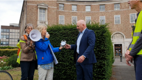 Pip Sheard of Taunton Area Cycling Campaign gave the list of requests and an alarm clock (to wake up the County Highways Dep) to County Highways political boss, John Woodman.
