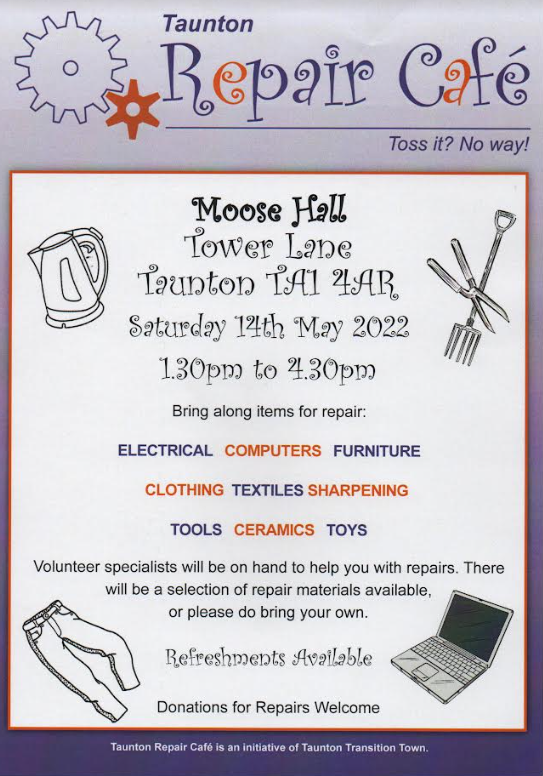 May 2, 2022August 8, 2022 shuunyanet Taunton Repair Cafe – May 14th – Big Fixit Day Share this:Share Share on Facebook (Opens in new window) Facebook Email a link to a friend (Opens in new window) Email Share on X (Opens in new window) X Like Loading... Related