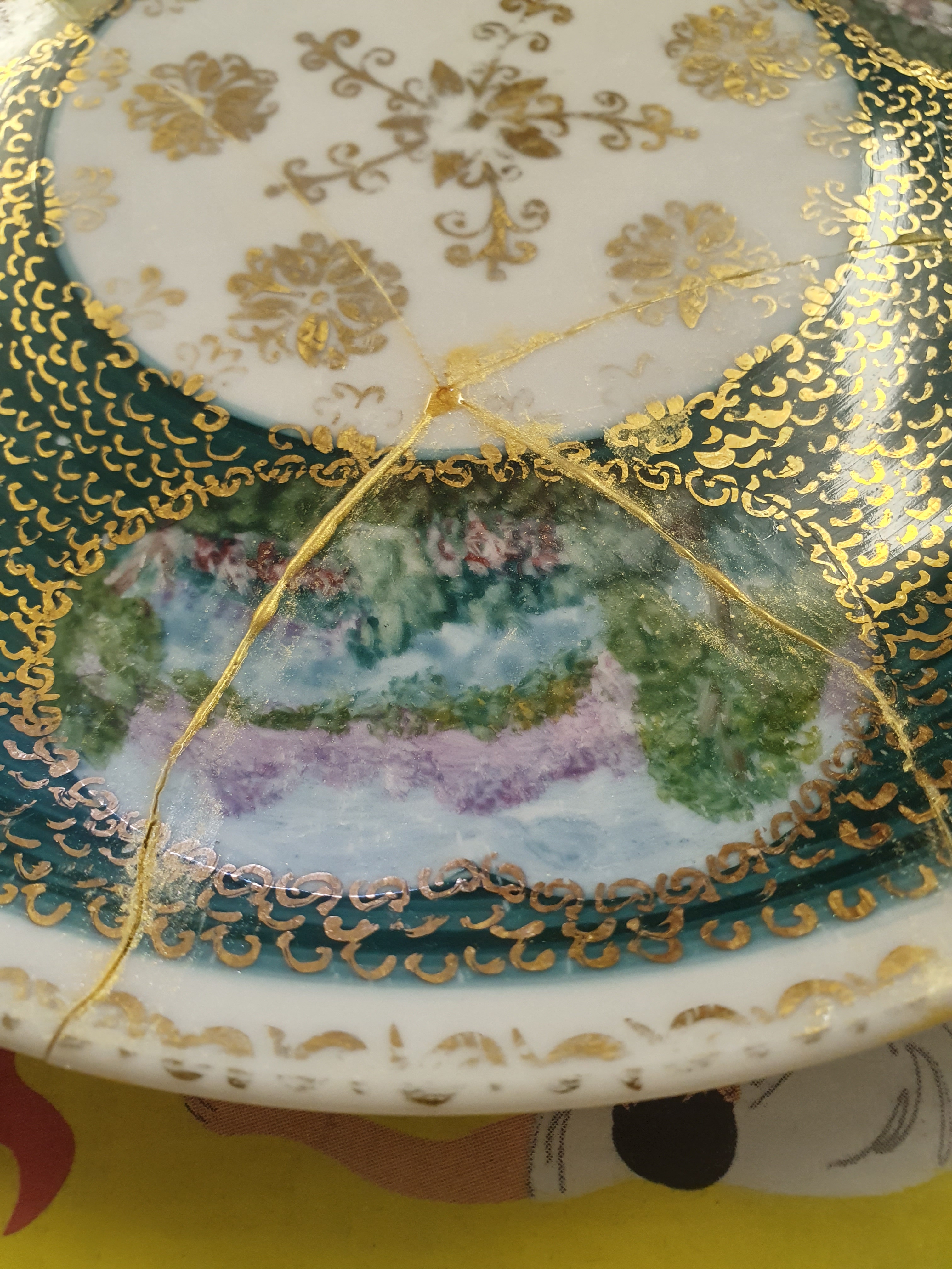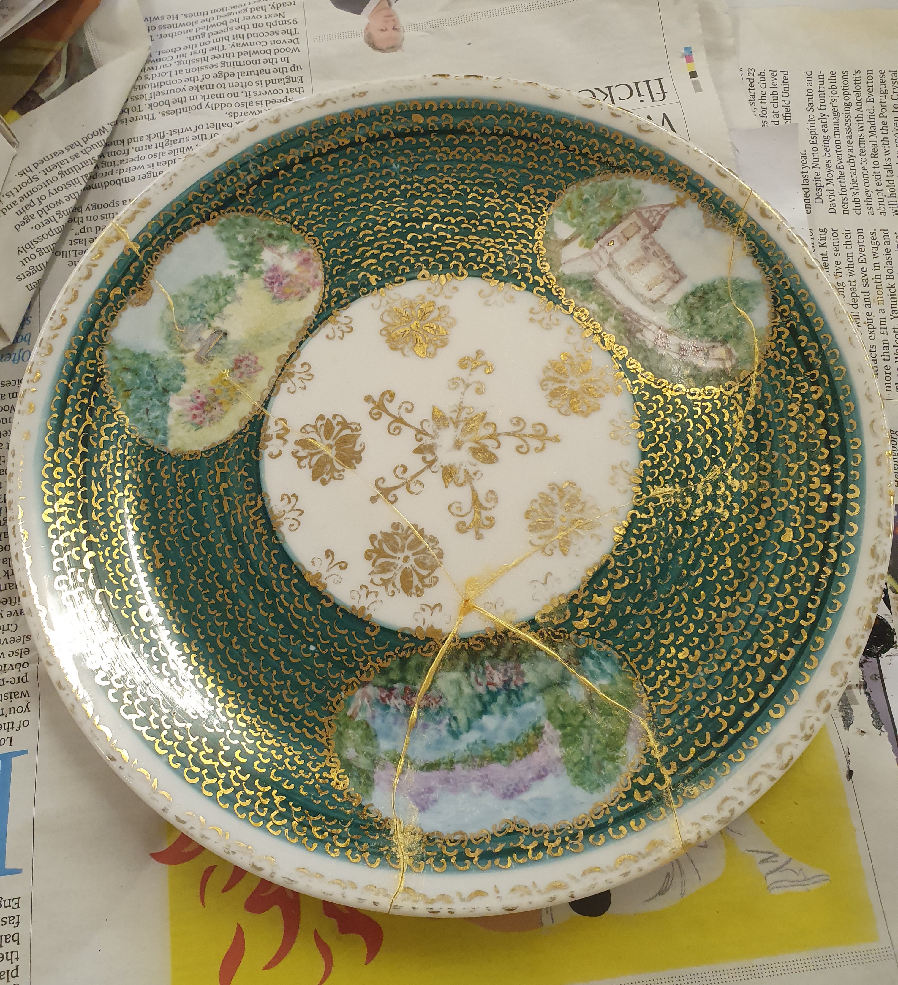 - 4 gluing of bloken items, including a hand painted plate, a ceramic animal, and a broken casserole dish