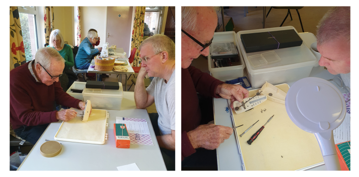 - 4 other items were fixed – a broken bracelet catch, another broken TV remote button (Vicky fixed one last time), a broken plate from last session and a new challenge for Bruce: a metronome which could not be wound up.