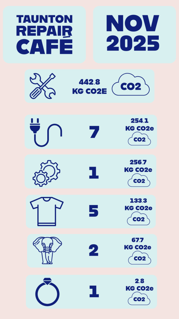 We have used the Repair Café Carbon Calculator once again developed by Steve Privett, Professor Martin Charter of Farnham Repair Café and the University for the Creative Arts (UCA) which calculates the KG of CO2 saved by repairing each item.